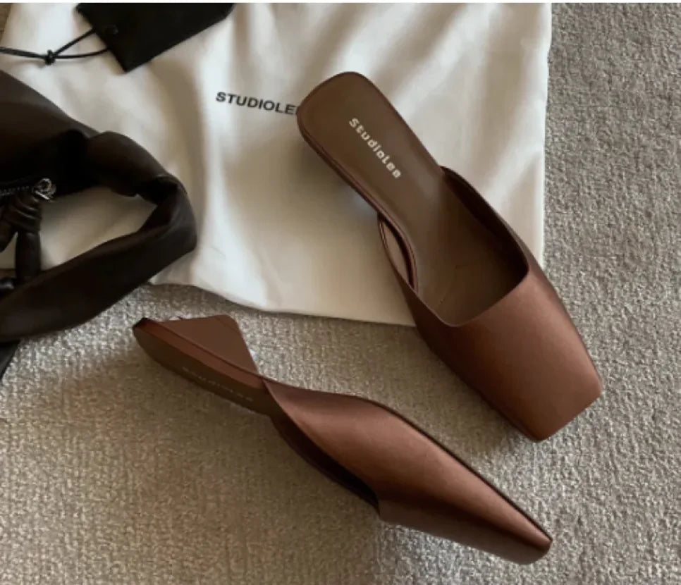 These casual mule sandals feature a satin upper with a square toe design and a comfortable microfiber lining. Available in Dark Night Black, Gilding Green, and Amber Brown, they come in sizes 34–40. The slippers have a durable rubber sole, perfect for everyday wear.