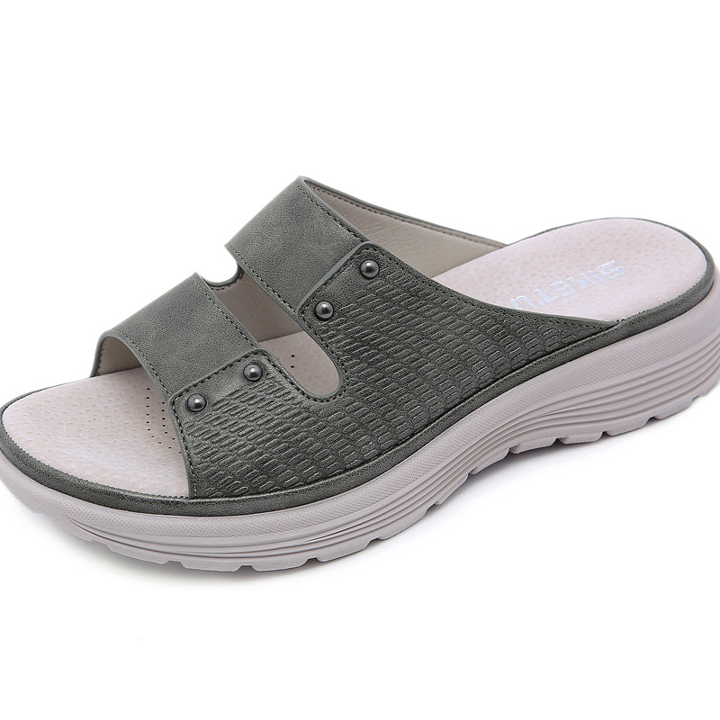 Experience the perfect blend of comfort and elegance with the Women's Simple Leather Rivet Wedge Slippers. Elevate your footwear collection today!